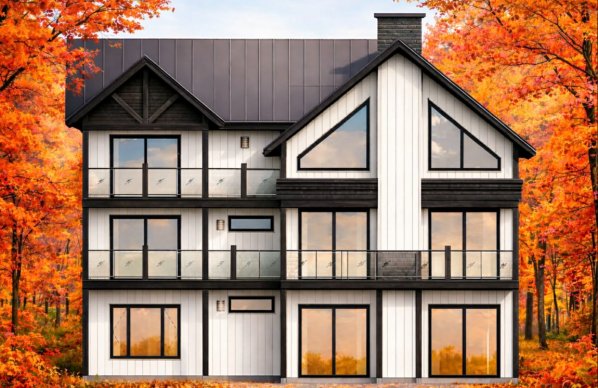 La façade met en valeur un revêtement vertical clair contrasté par des accents foncés, une toiture métallique moderne ainsi que de généreuses fenestrations qui maximisent la lumière naturelle. Les balcons vitrés à l'étage ajoutent une touche résolument actuelle et offrent des vues dégagées sur l'environnement extérieur.